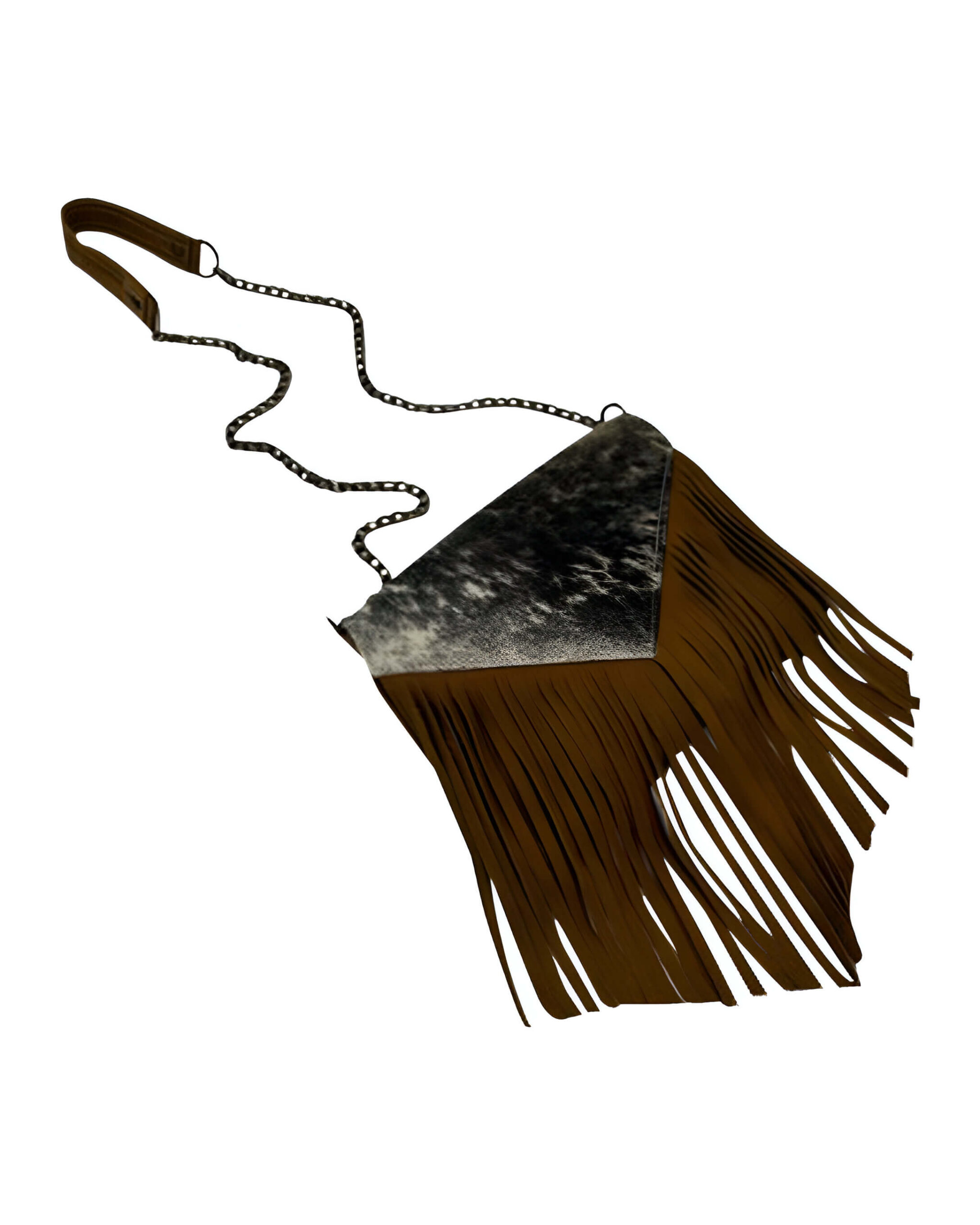 La Bolsa Delta es geometría salvaje. Su cuerpo triangular combina piel vacuna moteada con gamuza suave, rematada en cascada de flecos que fluyen con cada movimiento. La cadena metálica aporta un contraste urbano, perfecto para quienes caminan entre lo bohemio y lo rockero.