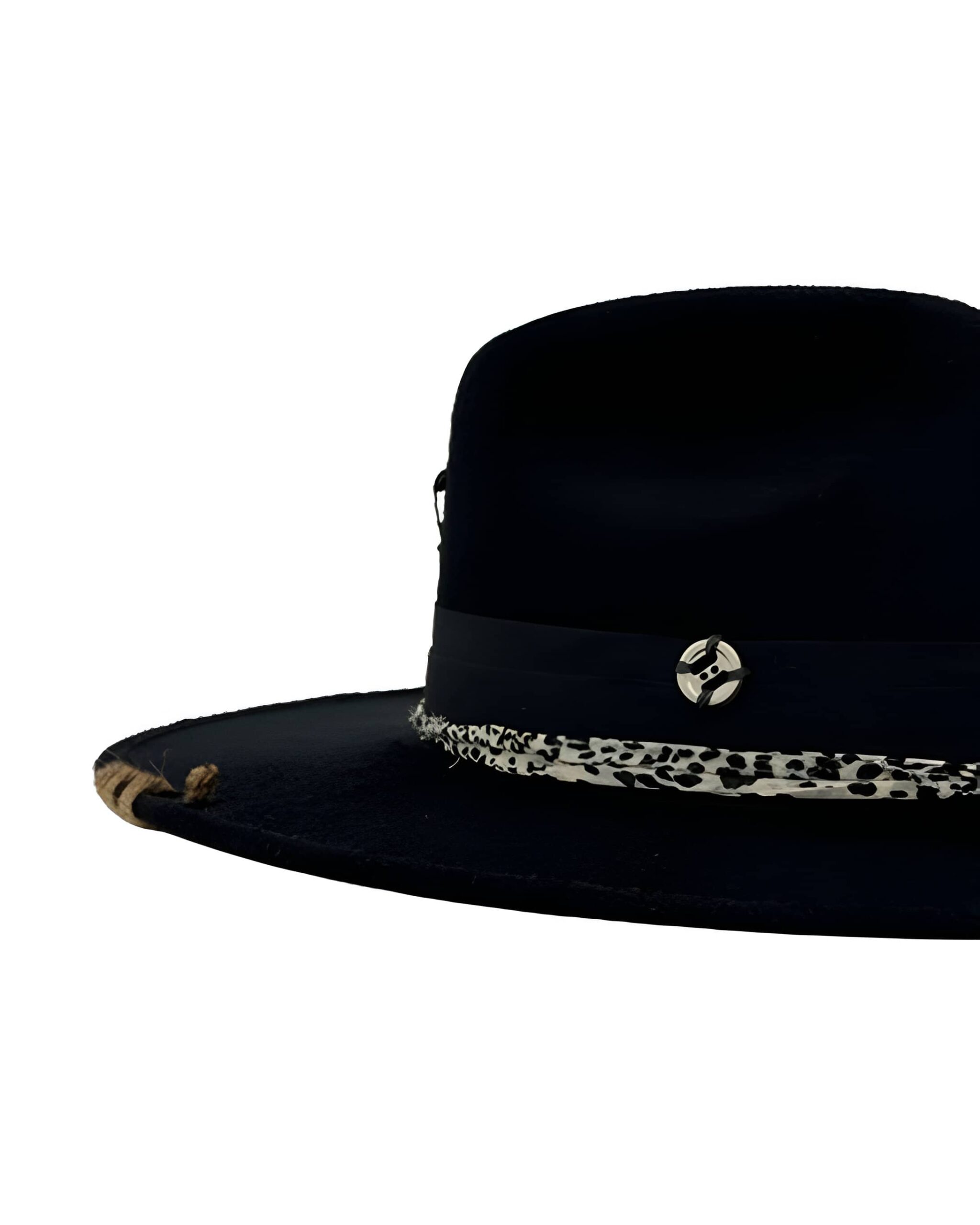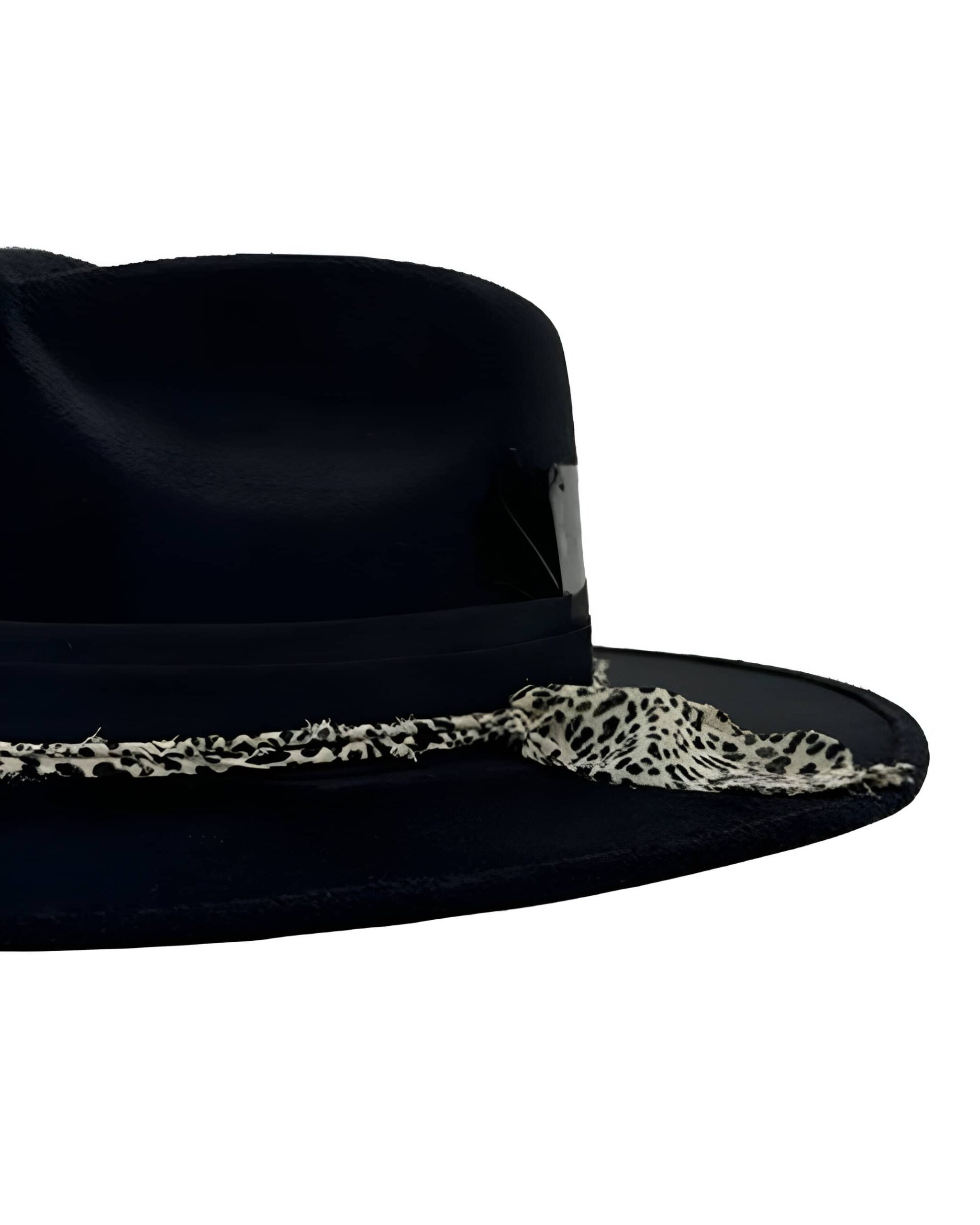 Negro profundo con actitud urbana. La cinta negra con pañuelo animal print deshilachado y detalles metálicos aporta ese carácter rebelde y sofisticado propio de Clandestino.