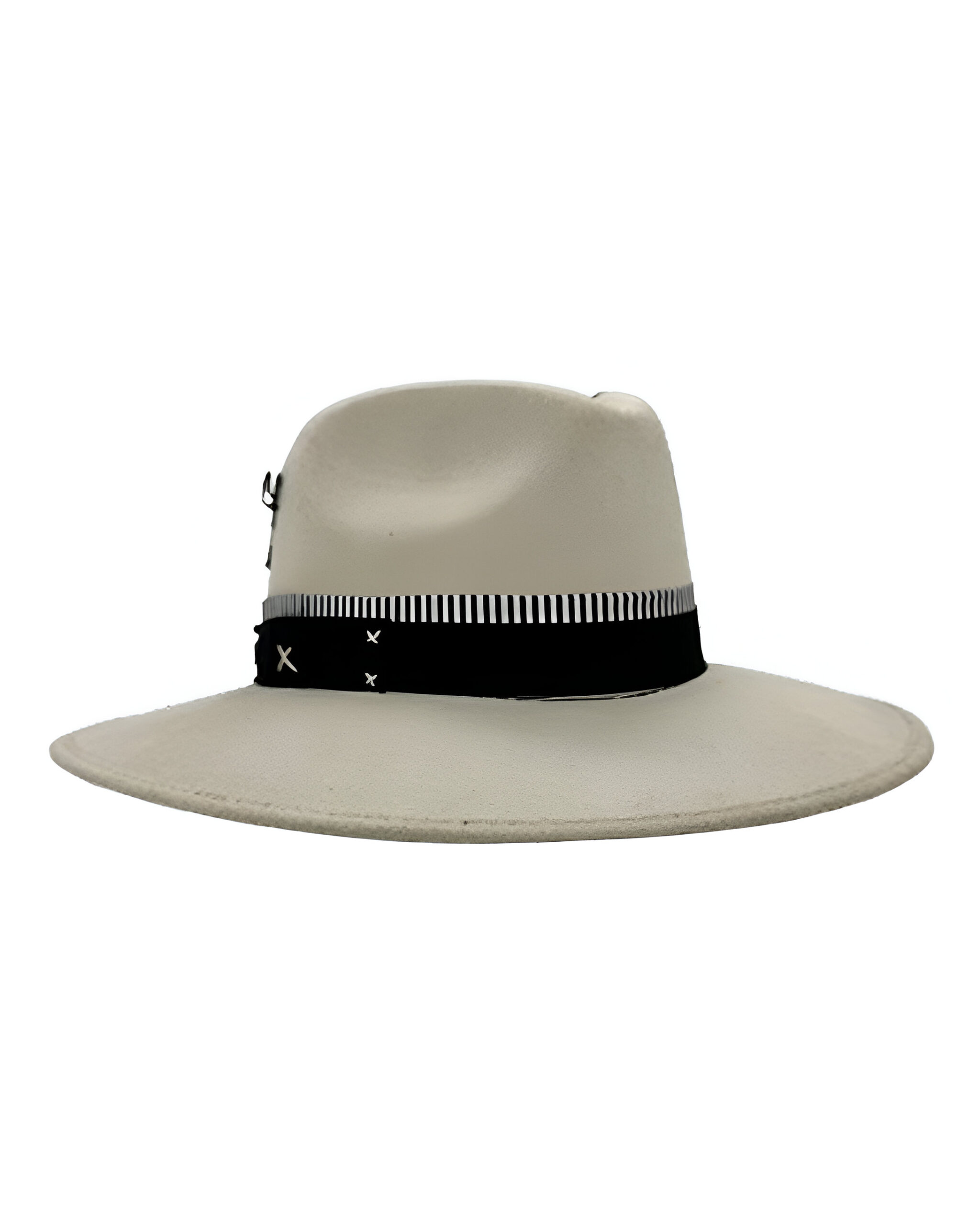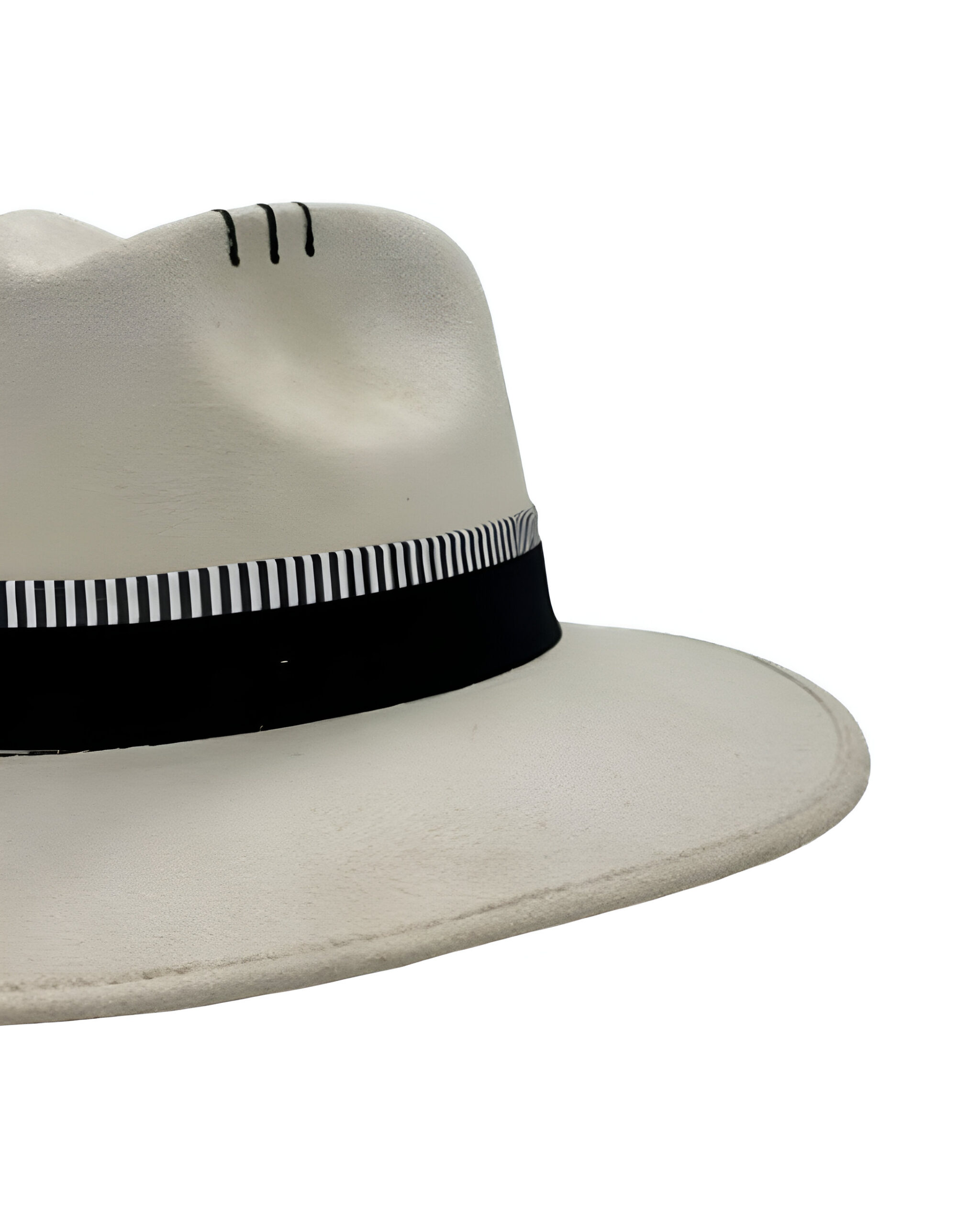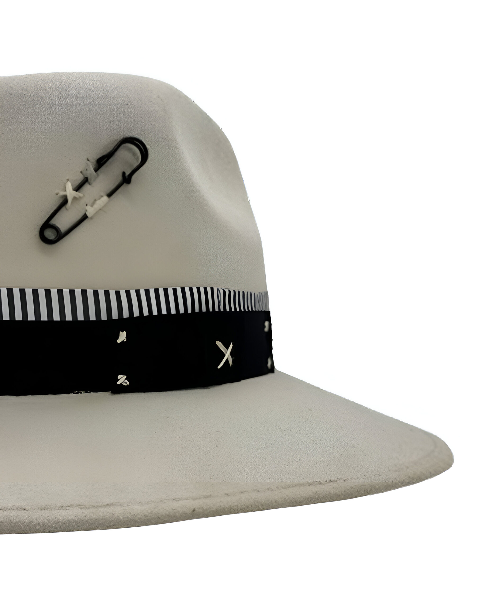 Elegancia clara con un guiño disruptivo. Su tono hueso contrasta con la banda negra de bordados en cruces blancas y la cinta rayada en blanco y negro, creando una pieza única con carácter urbano y esencia Clandestino.